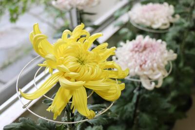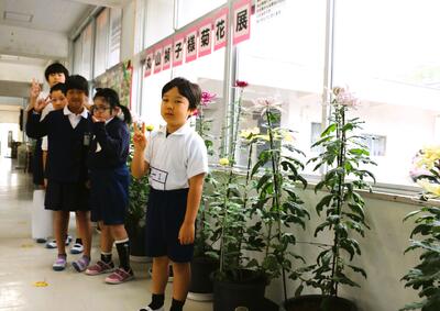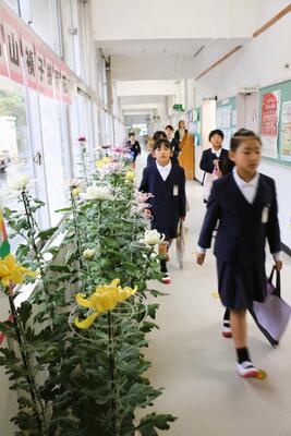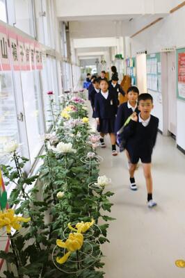 今年も地域にお住まいの丸山様が、たくさんの立派な大輪の菊(大菊)をお持ちくださいました。さっそく廊下や玄関に飾らせていただくと、通りかかる子どもたちから「わあ、きれい」といった感想があがり、廊下が一気に潤いのある素敵な空間になりました。子どもたちの笑顔や声からも、菊の華やかさが伝わってきます。地域の方々の温かいご支援に感謝しつつ、季節の花が彩る学校生活の楽しさを改めて感じるひとときでした。