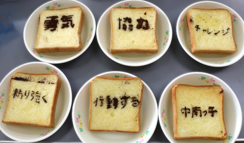 今日の給食は「勇気・協力・チャレンジ 粘り強く 行動する 中南っ子」。スローガンが書かれたパンでした。調理員の方々のお心遣いに感謝いたします。