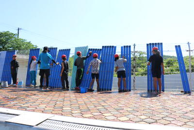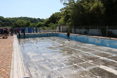 5月27日(火)の午後、5.6年生の児童と職員でプール掃除を行いました。約1年間ぶりのプールは、飛んできた枯れ葉や砂などがプールの底や壁面にへばりついていました。まず、バケツなどを使って砂を取り除き、その後デッキブラシを使って一生懸命に床や壁を磨きました。天候にも恵まれ、気持ちよく掃除を進められました。今後、少しずつ水をためていき、6月6日(金)にプール開きを行う予定です。子ども達が楽しく泳ぐ姿が今から楽しみです。