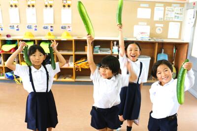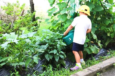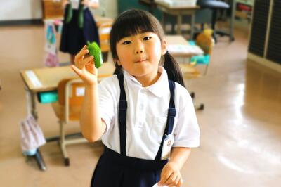 春先から学級園を耕し、学級ごとに野菜の苗を植えて大切に育てています。6月の半ばから一気に成長し、「キュウリ」や「オクラ」「ピーマン」などの野菜は収穫できるようになりました。水やりや草取りなどお世話をしてきた分、野菜がとれるのがとても嬉しいようです。収穫した野菜は各ご家庭にもって帰りますので夕食などで使っていただければ幸いです。