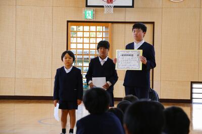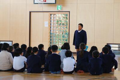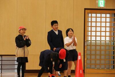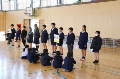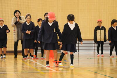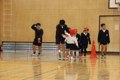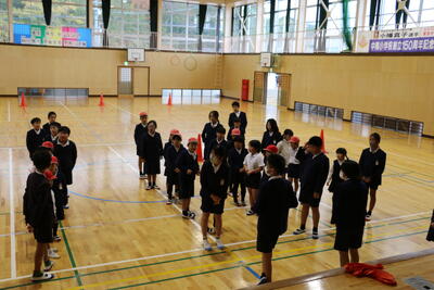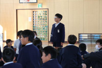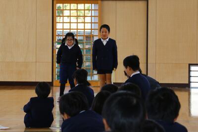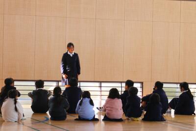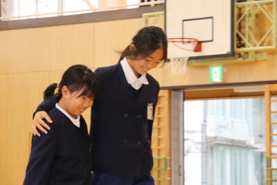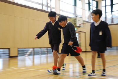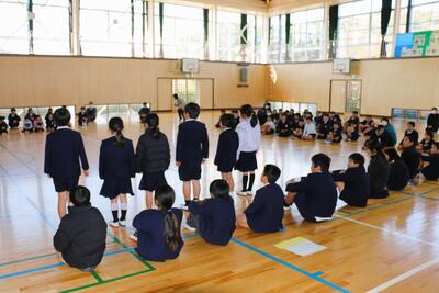 昼休みに、企画委員会の発案で縦割り班による「二人三脚」を行いました。この企画の勝敗はスピードではなく、いかに相手を思いやり、声を掛け合い、助け合えたか。転びそうになると「大丈夫?」「せいの1.2.1.2」と励ましの声が自然と広がりました。応援する友だちのあたたかい声も体育館に響き、学年をこえて心がつながる素敵な時間となりました。