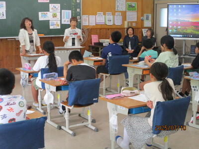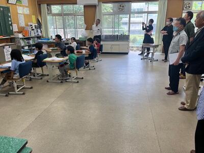 3年生と4年生は、外国語活動の学習があります。毎回、楽しそうに学習していますが、習ったことを実際に使わないことには身につきません。そこで、習ったことを実際に使うために職員室にやってきました。たまたま職員室にいた職員は格好の練習相手です。(職員も練習になります。)楽しい様子を廊下から見守る担任の温かい眼差しがありました。