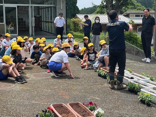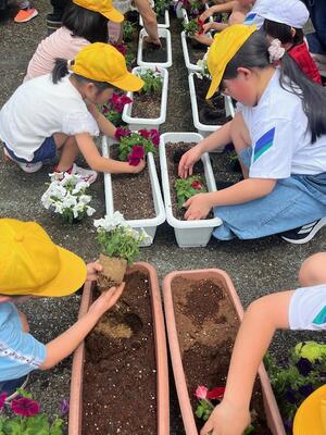 矢部高校から3種類の花の苗を購入しましたので、美化作業の時間に全校児童でプランターに植えました。
