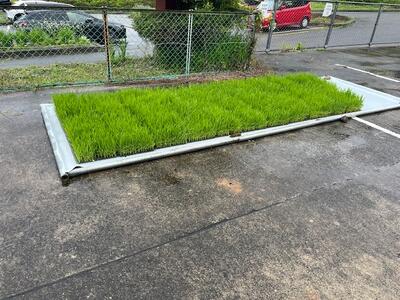 学校の駐車場の一角に苗床を作って管理しています。田んぼの準備の手配もしていただいているところです。