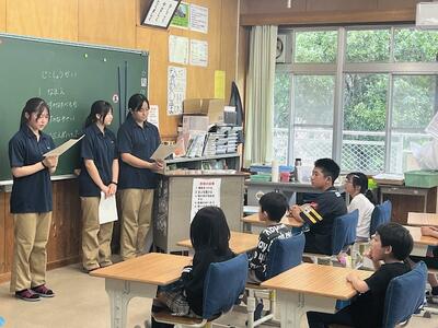 最初に、3・4年生の教室で高校生が矢部高校の学科や魅力紹介をしてくれました。高校生から、「中島小の良いところを教えてください」の言葉に、即座に男子数名がシュッと手を挙げて発表していました。