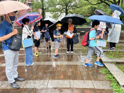 先生の「さっき匂いをかいだ花は、つつじって言うんだよ。」との話に、「聞いたことある」という声や「花になんか変な虫がいたよ」等々気づいたことや見つけたことを口々につぶやいたり、メモしたりしていました。きちんと約束を守って探検していました。