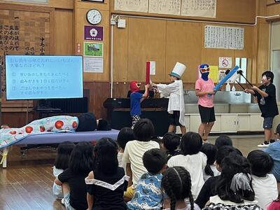 たくましく委員会主催で虫歯予防を訴えるお芝居を疲労してくれました。6年生を中心に、小道具を使って熱演してくれました。1年生に大受けでした。