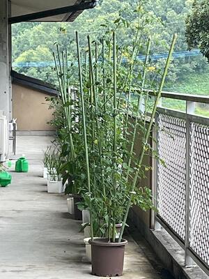 ベランダにはずらりとその鉢が並んでいます。子どもたちは毎日水やりを頑張っているので、ミニトマトは順調に育っていて、少しずつ収穫が始まっています。