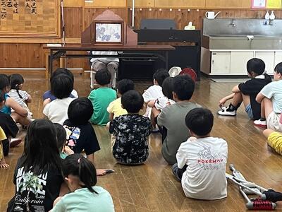 本日は、ホールに全員集合し、みんなで紙芝居を見ました。