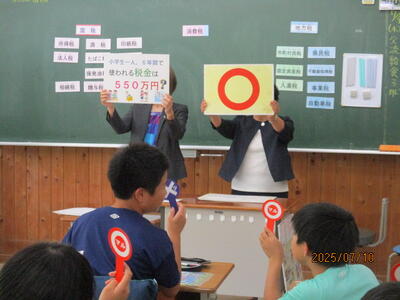 私たちが払う税金がどのようなものに使われているのかを具体例を挙げながら、分かりやすく説明してくださいました。日常生活の中で多くの物に税金が投入されています。私たちの生活を安全で清潔で暮らしやすいものにするためには、税金は無くてはならないものだと言うことが子どもたちにも伝わったと思います。