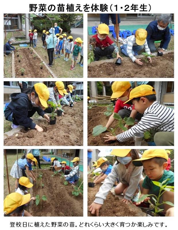 5月15日(金)の登校日、1・2年生の児童は生活科の学習で、毎年恒例の野菜の苗植えに取り組みました。