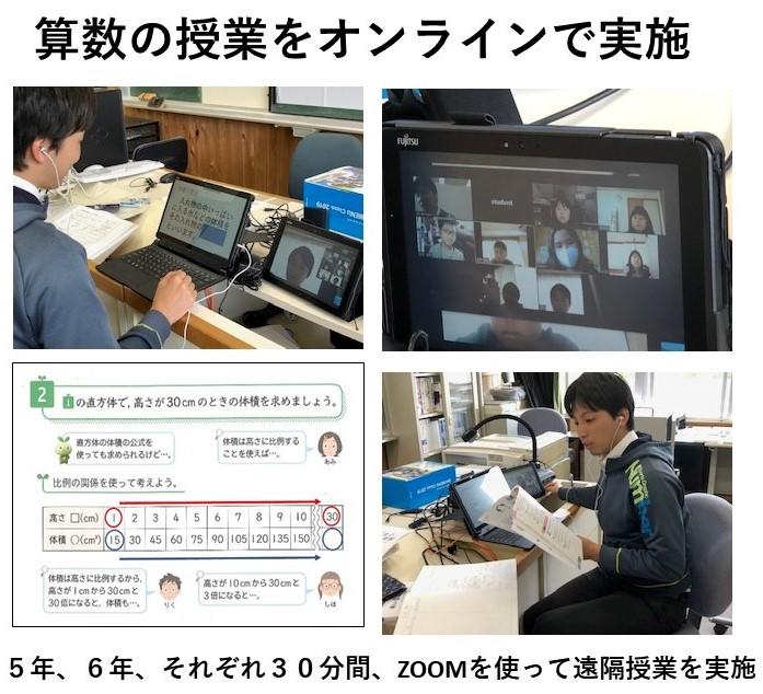 前回の試験運用での反省を生かし、5年・6年生、それぞれ30分間の算数の授業を行いました。5年生は「比例」の学習、6年生は「Xを使った式」について担任の先生から出された問題の画像を見ながら考え、画面越しにお互いの考えを出したり、説明を出し合ったりしました。先生からの質問や指示に対しても、しっかり反応できていて、遠隔授業への手応えを感じることができました。小規模校の特性を生かして、今後も遠隔授業を進めていきたいと思います。