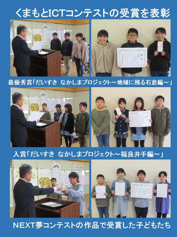 ICT作品部門には、6年生から3つの作品、5年生からは2つの作品を応募し、6年生の「だいすき なかしまプロジェクト~地域に残る石倉編~」が最優秀賞、5年生の「だいすき なかしまプロジェクト~福良井手編~」が入賞しました。