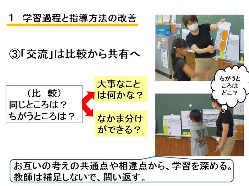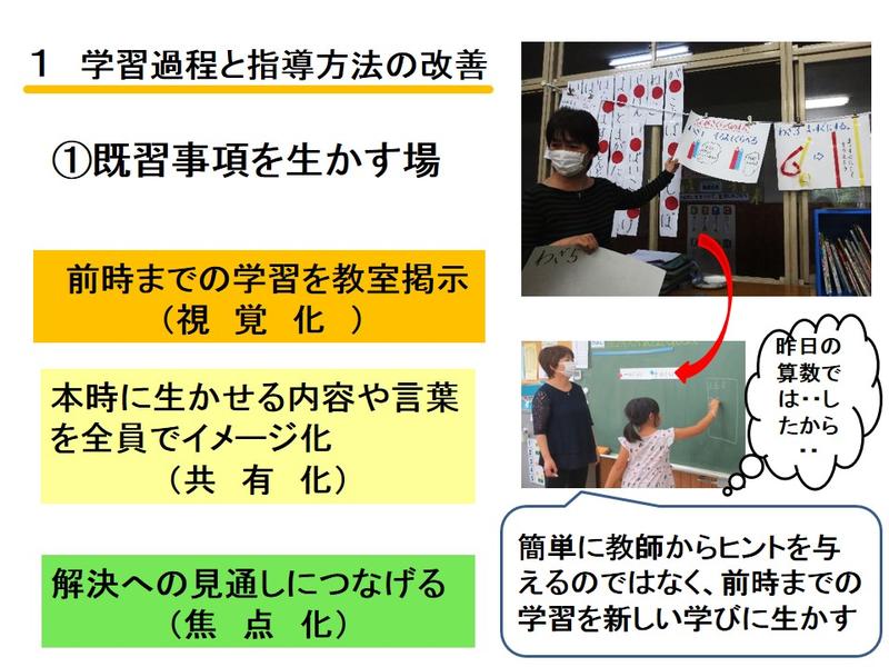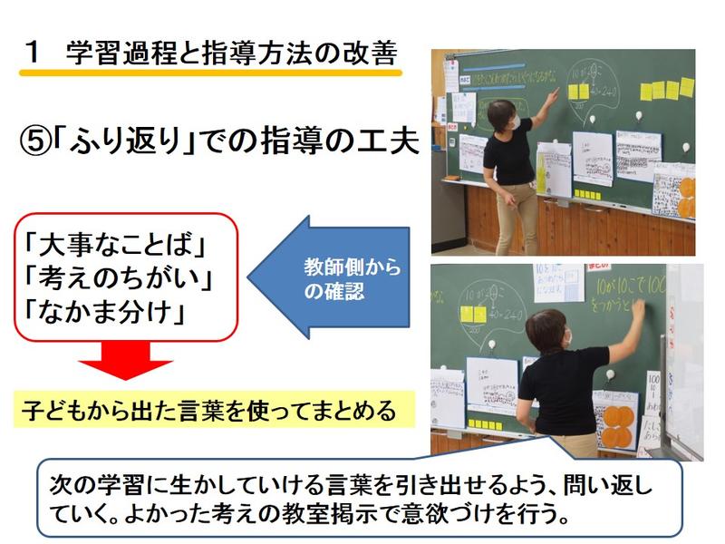 算数の学習での、「見える化(視覚化)」を図りながら学び合う学習、学習リーダーの育成、単元系統図を活用した主体的な学習についての説明を行いました。