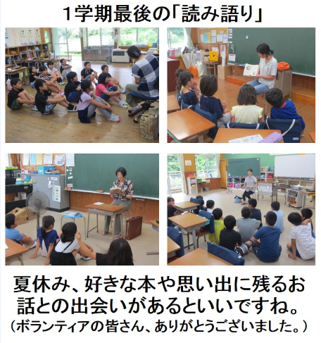 読み語りが終わり、ボランティアの方々と1学期を振り返ってお話をしていると、子どもたちが絵本や紙芝居に興味を持ちながら、たくさん本を読んでほしいと願っていらっしゃるのがよくわかりました。もうすぐ長い夏休みになりますが、たくさんの本と出会い、読書の時間をとることができるよう、学校と家庭で協力して取り組んでいけるようにしたいと思います。2学期もよろしくお願いします。
