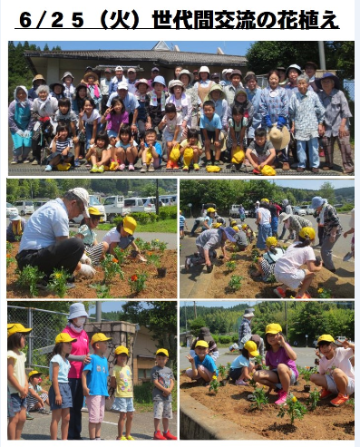 この世代間交流の花苗植えは、現在の中島小学校(平成17年)になってから、13年近く続いている行事のひとつだそうです。手際よく作業を進められる地域の方と、お話をしたり、手伝ってもらったりしながら、ふれあうことができた子どもたちでした。