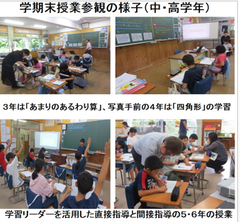 中学年は、3年生3人と4年生8人の複式学級。算数の「わり算を考えよう」であまりのあるわり算に取り組む3年生と、4年生の「四角形を調べよう」の学習に、取り組みました。直間指導といって、先生が直接指導する時間と、自分で学ぶ間接指導の時間があります。45分の時間を効果的に進められるよう、学習リーダーを活用した授業づくりを進めています。