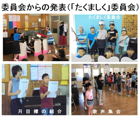 中島小では、毎週水曜日の朝を集会活動として、位置づけています。集会は、歌声集会、校長先生の話など、週ごとに決められている中で、活動をしています。これまで紹介してきた校長先生のお話以外で、特に「かしこく」「やさしく」「たくましく」委員会それぞれの部会が中心になっての発表(6月はたくましく委員会の歯磨き取組)や、歌声集会では、みんなで全校で今月の歌や校歌を歌ったり、学年ごとに発表をしたりしています。