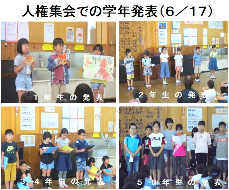 また、6月は人権旬間での学習として、低学年は『森のなかま』、中学年は『クレヨンはぬすんだのじゃねえ』、高学年は『原子雲の下で』を題材に人権学習を進めてきました。これまで学級で学んだことを、それぞれの学年から、集会の場で他の学年に向けて発表しました。各学年のの発表に対して、自分が思ったこと、感じたことを発表学年に対して、ひとつずつ返していきました。