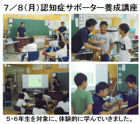 7/8(月)、5校時、5・6年生児童は、大矢荘よりゲストティーチャーを招いて、認知症サポーター養成講座を行いました。