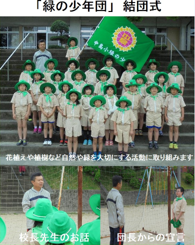 「緑の少年団」の結団式を行いました。3年生以上の子どもたちは、毎年、花植えや田植えなど体験活動を通して自然や緑を保全していく活動を進めています。