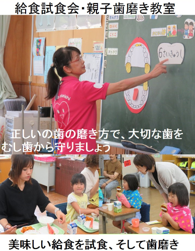入学して2カ月が過ぎようとする中、1学期の公開授業日に、毎年、1年生は給食試食会と親子歯磨き教室を実施しています。