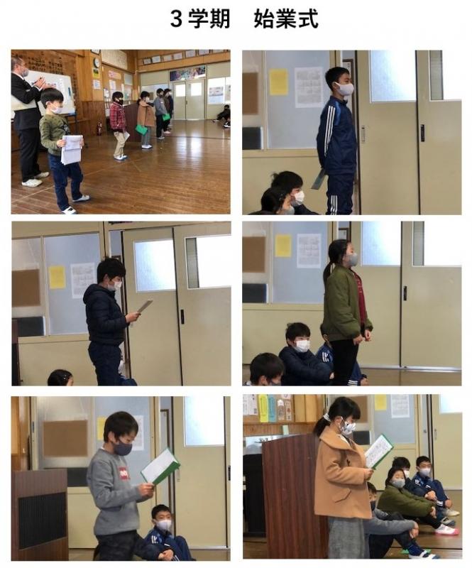 積雪のため、成人の日の翌日、1月12日(火)が、始業式となりました。まだ雪が残っている中でしたが、ホールで行った始業式。学年代表の子どもたちは、自分の目標などについて、はきはきと発表することができました。