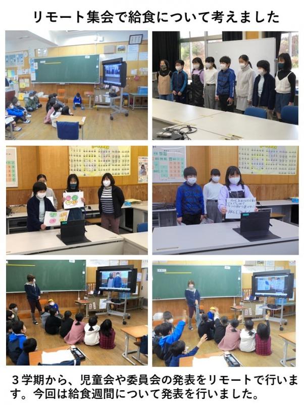 今回は、給食週間の期間に、やさしく委員会の子どもたちが、食育に関する問題を作り、各教室へ配信。他の学年の子どもたちは、各教室で画面を見ながらクイズに応え、リモート集会に取り組むことができました。