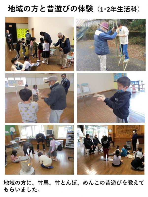 1・2年生児童は、1月26日(火)に生活科の学習で、地域の方々といっしょに、昔遊びの活動を行いました。地域の方に遊び道具を準備していただき、その遊び方を教えていただきました。  班ごとに竹馬、竹とんぼ、めんこの3つの昔遊びを体験。竹馬は経験がない子どもたちもいて、最初は苦戦していましたが、だんだん慣れてくると楽しくなり、みんなで元気に遊ぶことができました。地域の方とふれあいができて心温まる時間にすることができました