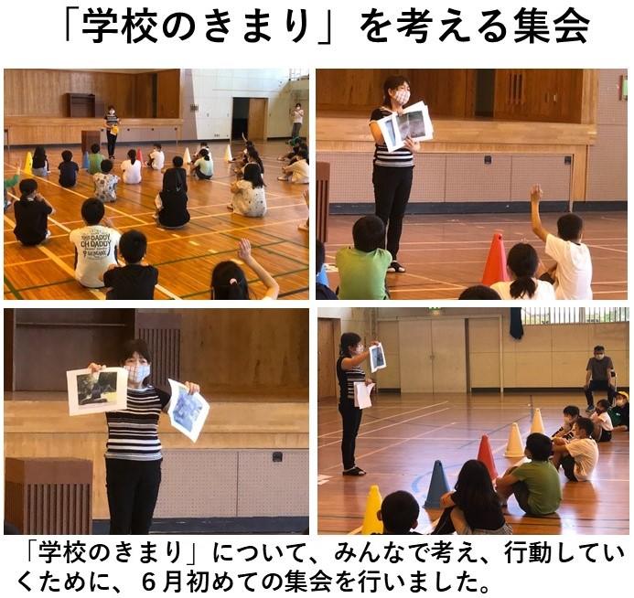 6月になって学校再開後は、子どもたちができるだけ密の状態にならないように、集会の実施を見合わせてきました。これまではホールで、校長先生の話や児童会・委員会からのお知らせなど、全校児童で積極的に進めてきました。この日は一人一人が座る距離を保つために、広い体育館で窓を開けた状態で集会を行いました。