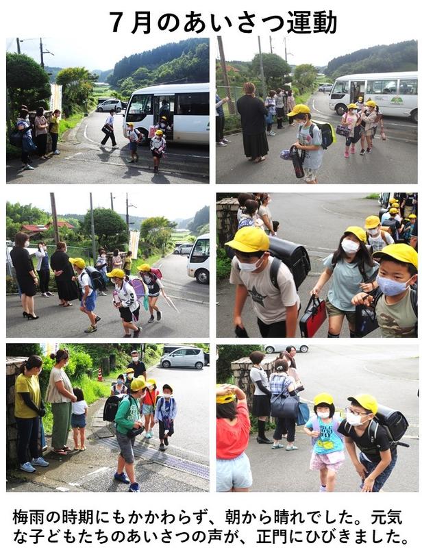7月のあいさつ運動は、梅雨の時期なので朝からの雨を心配していましたが、幸いなことに快晴。この日は1・2年生の保護者の皆さんに協力してもらい、あいさつ運動に取り組みました。