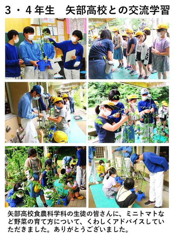 今回、3・4年生の児童は、高校2年生の皆さんに、ミニトマト栽培活動でのアドバイスを受ける交流活動を行いました。自分たちが育てているミニトマトを、もっと大きな実になるようにするためには、どんな育て方をすればいいのか、栽培のポイントを教えていただきました。