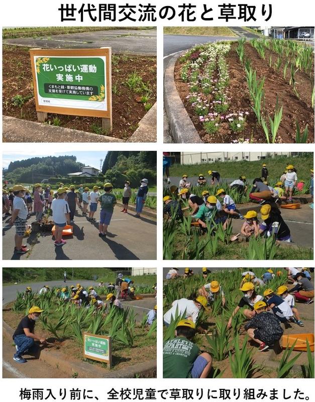 学校前の花壇には、たくさんの花が咲いています。毎年行われている世代間交流事業では、地域のたくさんの方々が、子どもたちと一緒に花の苗植えに取り組んでいただいていますが、新型コロナウイルスの影響で中止となりました。今年は、事業に関係していただいている数名の地域の方の手により、球根植えと苗植えを行い、それらから今、たくさんの花を開かせています。来校される方も、咲きほこる花々を見て、「きれいな花が咲いていますね。」と声をかけていただき、心癒やされる中島小の空間になっています。その世代間交流の花壇の草取りを全校児童で行いました。梅雨入り前の晴れの日を生かして、全校児童で一生懸命取り組むことができました。