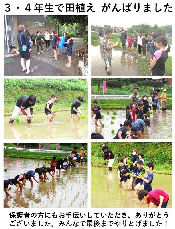 この苗が秋には実り、給食で食べるご飯になります。これから草取りや観察を進めていく中、「大きく育ってね」との思いを込め、田植えに取り組んだ3年・4年生でした。