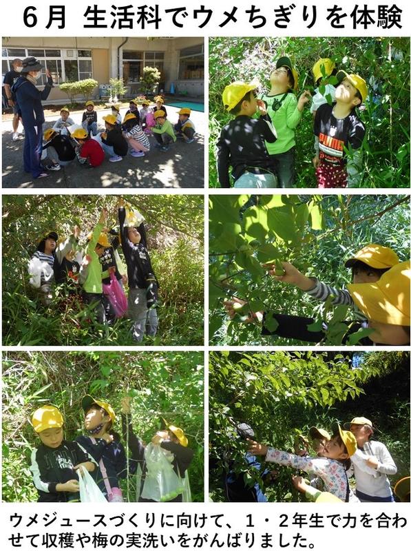 梅雨の合間の晴れ間に、1・2年生の児童は、毎年恒例のウメちぎりに出発。今年は2回目となる2年生が、1年生をしっかりリードして生活科の体験学習を行いました。