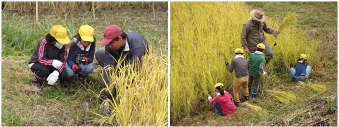 26日(金)2時間目に、3,4年生とPTA役員、緑の少年団部の皆さんで、稲刈りをしました。今年は、コンバインもはいって、作業終了です。