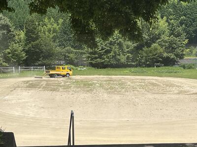 これは、教頭先生が雑草対策のために、トラックで運動場の表面を重いH鋼を引いて削っているところです。