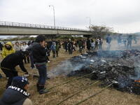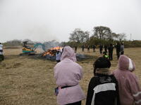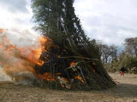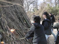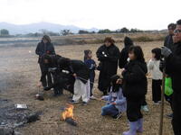 雪の降る中、正月恒例のどんどやをしていただきました。休日でしたが、たくさんの児童が参加しました。高く積み上げられた竹や藁に火が灯されると、大きな炎が上がりました。子どもたちはその迫力に驚きながらも、伝統行事の重みを肌で感じている様子でした。火が落ち着いた後のお楽しみ、持参したお餅やマシュマロを焼いて食べました。