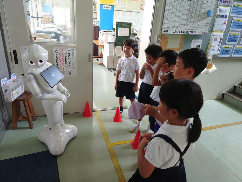 玉名市教育委員会から期間限定で、pepper(ペッパー)くんを借りることができました。これは、玉名市とソフトバンクロボティクス株式会社がプログラミング教育推進のための協定を結ぶにあたり、事前にロボットと触れる機会を設けるために行われた事業です。9月11日~9月15日までの一週間でしたが、プログラミング学習やラジオ体雄、朝の挨拶活動など大活躍のpepper(ペッパー)くんでした。最後の日は、別れを惜しむ子どもたちでいっぱいでした。pepper(ペッパー)くんロスにならなければいいのですが。