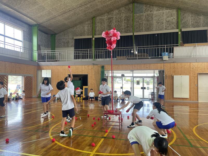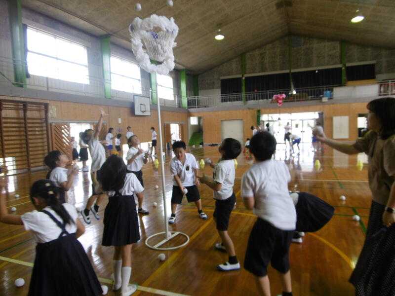 9月13、14、15日の3日間にわたり、昼休みの時間に玉入れ大会がありました。これは、児童会の健康安全委員会が、異学年の交流と体力向上・運動に親しむことを目的に企画したものです。アンケートの作成や実施に向けた説明などは委員会の児童が中心になって行いました。