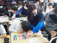 さかい製餅店の和菓子職人、酒井先生(ものづくりマイスター)に来校していただき、『練り切り』づくりに挑戦しました。酒井先生が作った作品を最初に見て、「難しそう…」「私たちにできるかなあ?」と言っていた子どもたちでしたが、丁寧に教えていただいて、子どもたちは楽しみながら作ることができました。自分が作った初めての『練り切り』を大事そうに家に持ち帰った子どもたちでした。