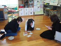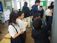 1年生との交流では、一緒にマツボックリのけん玉を作って遊びました。この日のために、マツボックリを拾いに行ったり、作り方を教える練習をしたり、準備をとても頑張っていました。はじめは緊張していましたが、仲良く、楽しく遊ぶことができて、大成功に終えました。