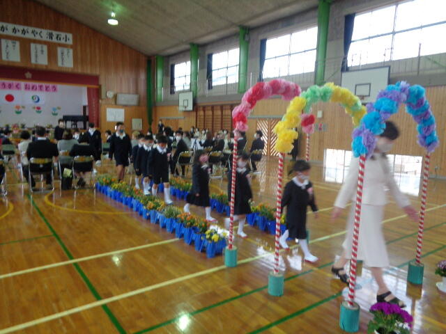滑石小学校では、10人の1年生が入学してきました。新入生氏名点呼では、みんなしっかりと返事をすることができました。また、校長先生の話もしっかりと聞くことができ、すばらしい入学式でした。