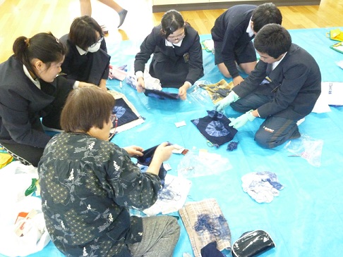 実際の体験では、糸で絞り上げることが大変難しく、苦労していました。スタッフの方が、たくさん手伝ってくださいました。染料につけて、染めていくと、すぐに染まるのではなく、20分ほどの時間をかけてもみ込んでいくことにも驚いていました。今回は、スタッフの方が残りはやっていただきました。一番喜びが大きかったのは、糸をほどいた時です。自分なりの模様が現れると、大変満足げに笑顔を浮かべていました。