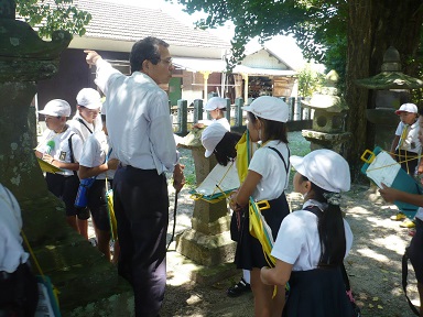 7月9日(木)に、晒のお宮へ行ってきました。『なめいしふれあい発見隊!!』で調べるお宮の中で、子どもたちが一番楽しみにしていたのが、晒のお宮でした。晒のお宮と言えば『龍の伝説』!!みんな、晒のお宮に封印してある龍に興味津々で、『いつ、だれが、どのようにして封印したのか』、『封印した人はまだ生きているのか』、『龍は本当にいたのか。』など、知りたいことがたくさんありました。