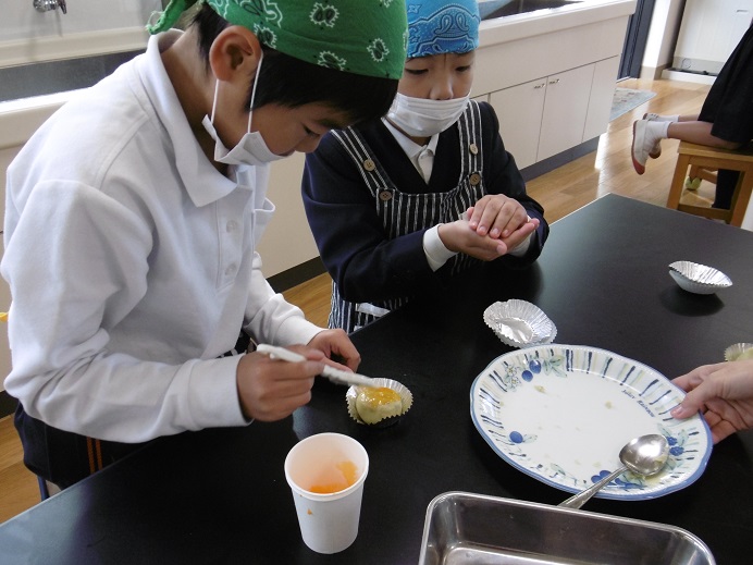 スイートポテト作り をしました。作り方の説明を聞いて、グループごとにゆであがったいもに砂糖を混ぜてつぶす、丸める、卵黄をぬるという作業をしました。3・4時間目をしている間にオーブンで焼いてもらい、給食のデザートとしていただきました。家でも作ってみたいとの声があがっていました。
