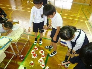 1・2年生合同でおもちゃ大会をしました。どちらも生活科で手作りしたおもちゃで、2年生はトイレットペーパーやペットボトルなどの廃材を利用して作ったもの、1年生はまつぼっくりやどんぐり、オナモミなど秋の木の実や葉っぱを使って作ったものです。だから同じ魚釣りでも材料が違います。どちらも興味津々で、お互いに入り交じって遊び方を聞きながら、楽しいひとときを過ごすことができました。