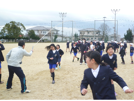 寒い冬季には体も温まる縄跳びの練習にも取り組んでいます。 8の字跳びが人気で跳んだ回数を伸ばそうと、かけ声を掛けながら,跳んでいます。