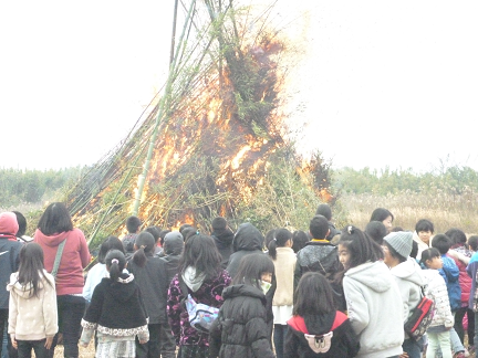 立ち上がった“どんどや”に8地区の代表児童が点火すると歓声が上がりました。竹は勢いよく燃え、あちらこちらから破裂音が聞こえてきました。