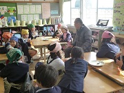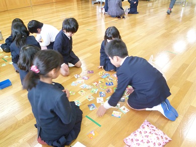 老人会の方をお招きして、昔遊びを教えていただきました。写真は、カルタをしているところです。